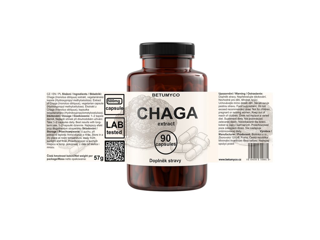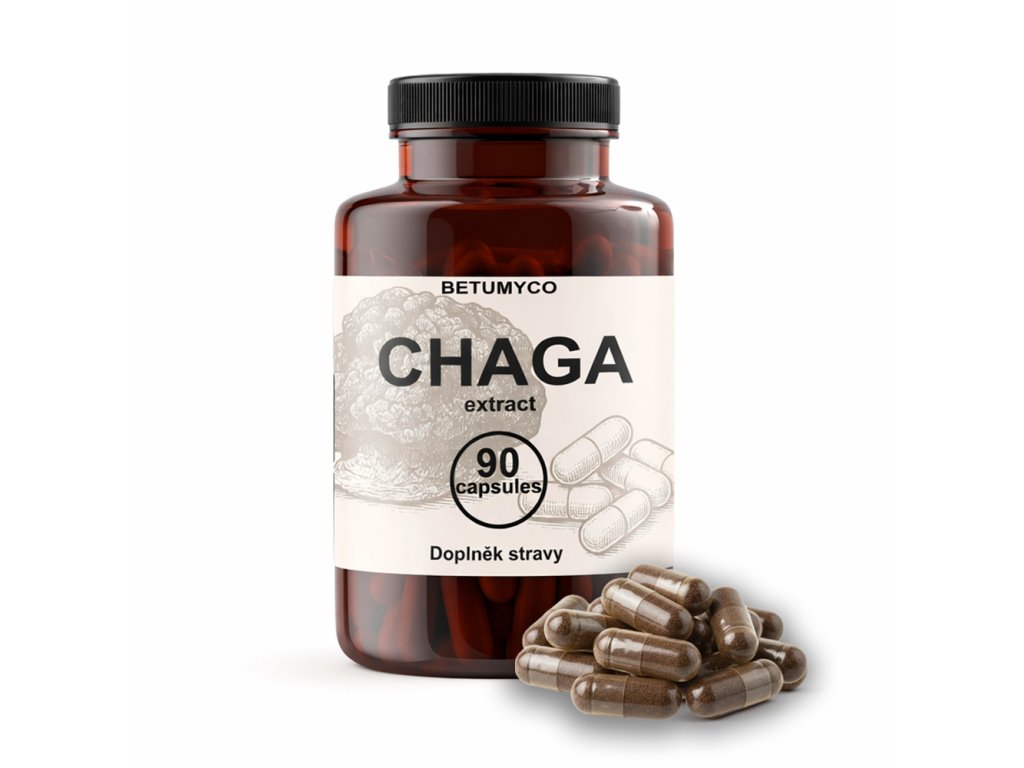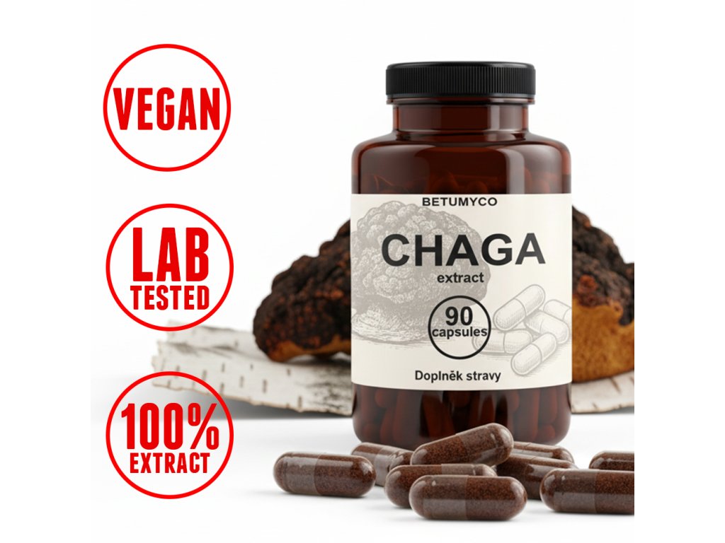 - Extrakt z plodnice houby čaga (Inonotus obliquus) – 500 mg